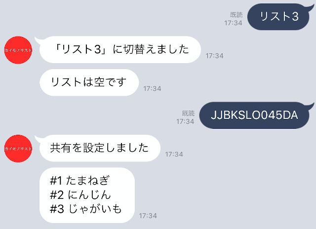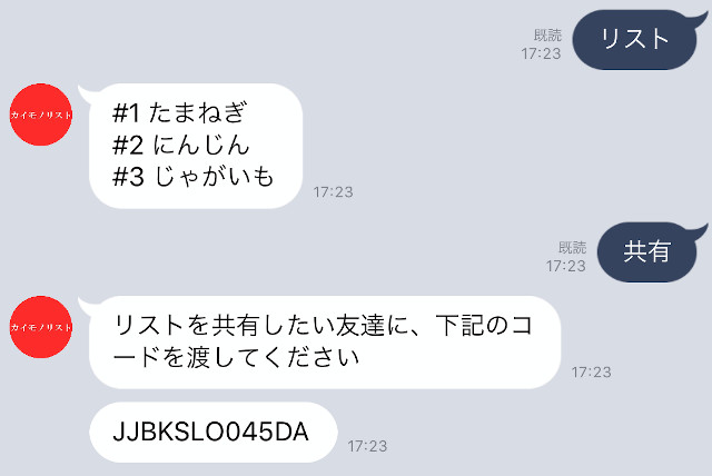 コードを受け取ったら、共有に使いたいリスト(1〜5)に切り替えて、カイモノリストにコードを送ってください。